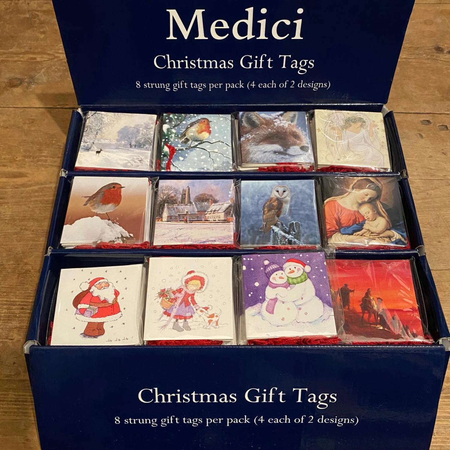 Pack of 8 gift tags with red string loops.