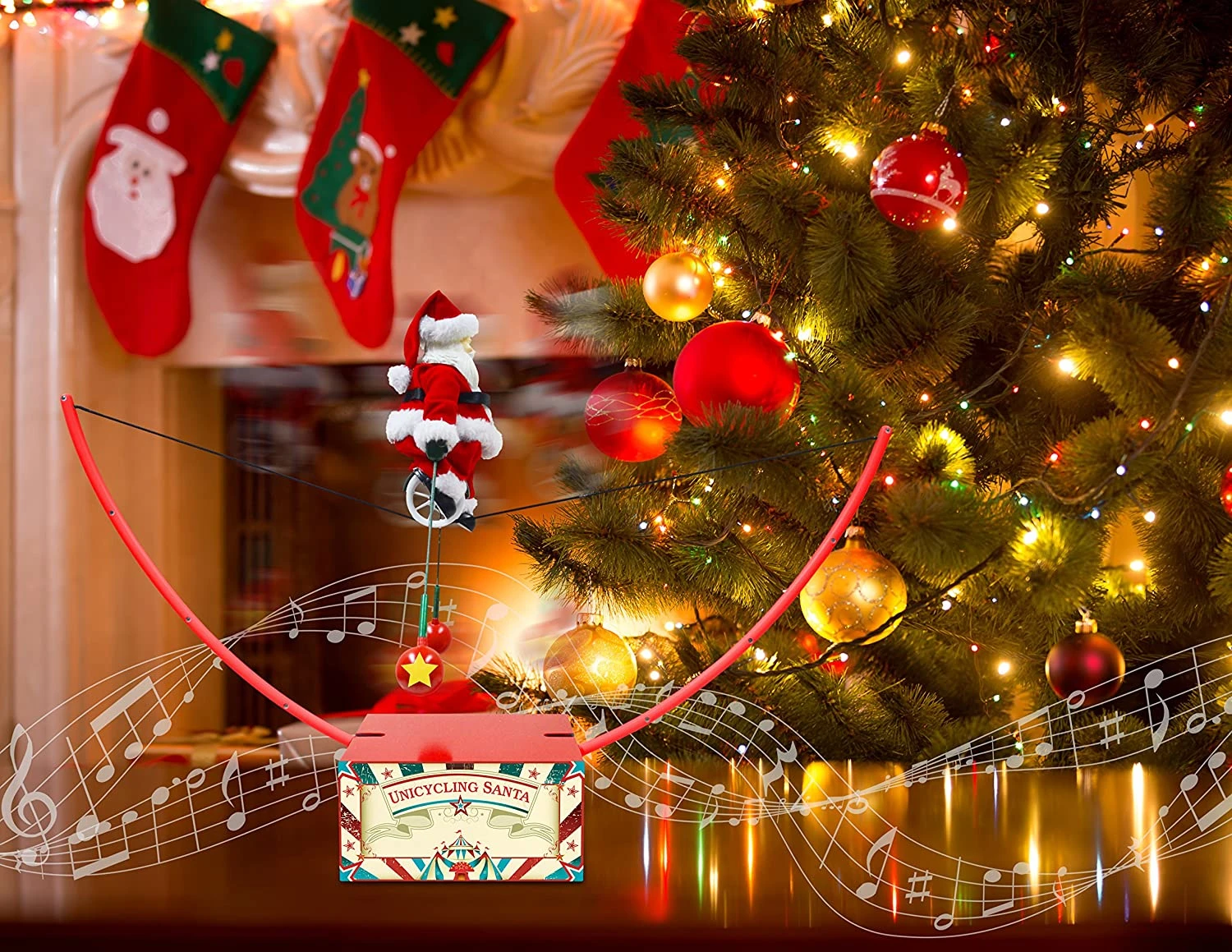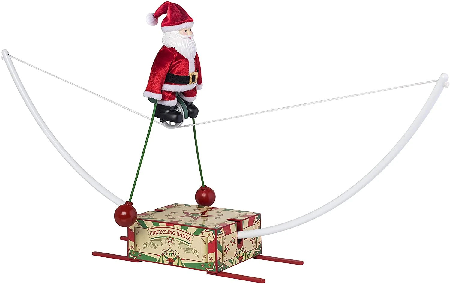 Unicycling Santa is the star of the show at the North Pole circus, and the next stop on tour is your home. It’s easy to delight in the whimsy of Christmas with Santa atop his tightrope with balancing rods to keep him floating effortlessly back and forth. As the rope tilts, Santa does not falter and stays looking regal dressed in his real fabric outfit with a smile on his highly detailed molded face.
