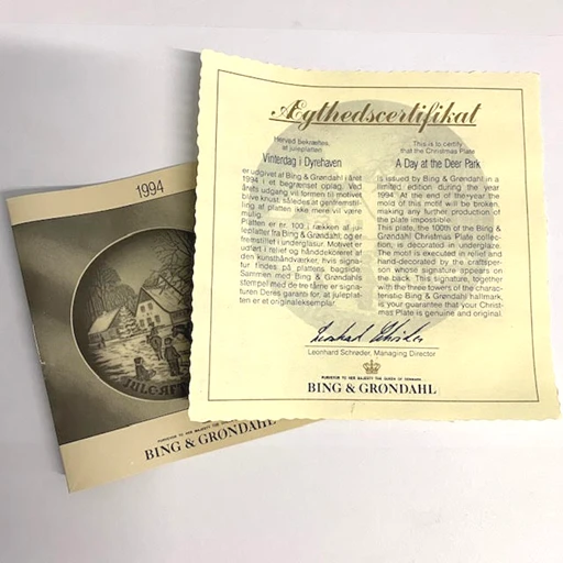 1994 Bing & Grondahl Christmas plate, designed by Jørgen Nielsen, is titled ‘A Day at the Deer Park’ in Copenhagen.
