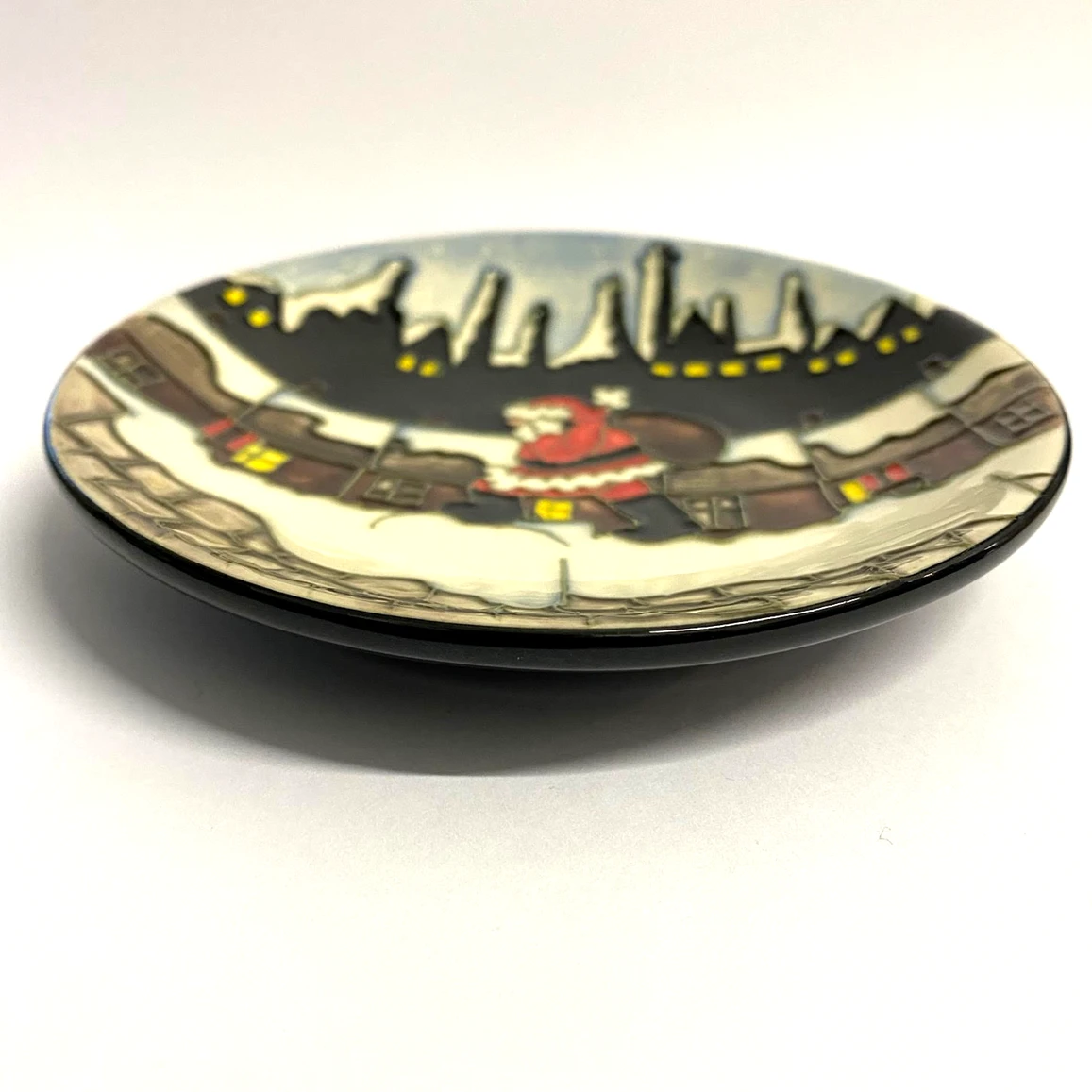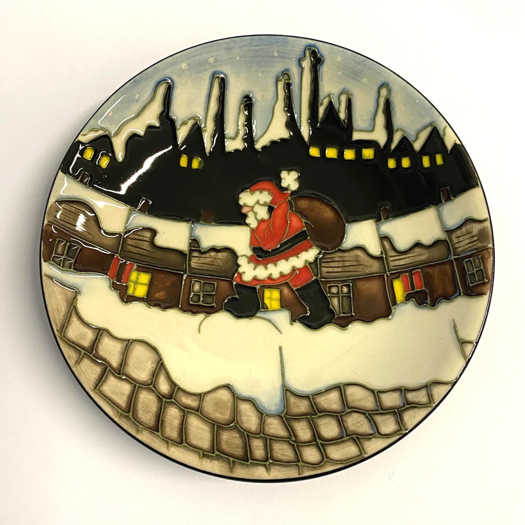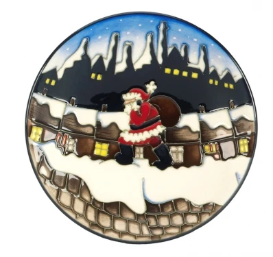 Christmas in the Pots Tray 780/4 is part of the Moorcroft Christmas Trio 2012. The Christmas in the Pots collection shows a scene of early morning snow covered bottle kilns silhouetted against a starry sky. Santa preparing to climb down the chimneys to deliver his presents, bringing joy and happiness to all.