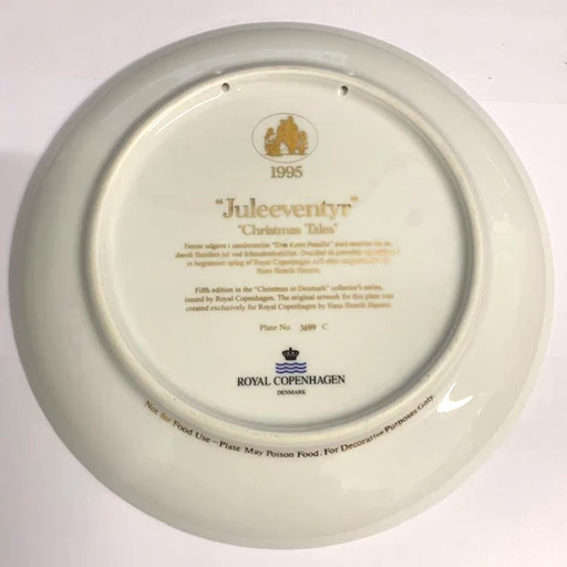 1995 Royal Copenhagen Christmas plate in the Christmas in Denmark series, designed by Hans Henrik Hansen. The title of this 1995 Christmas in Denmark plate is ‘Christmas Tales’.