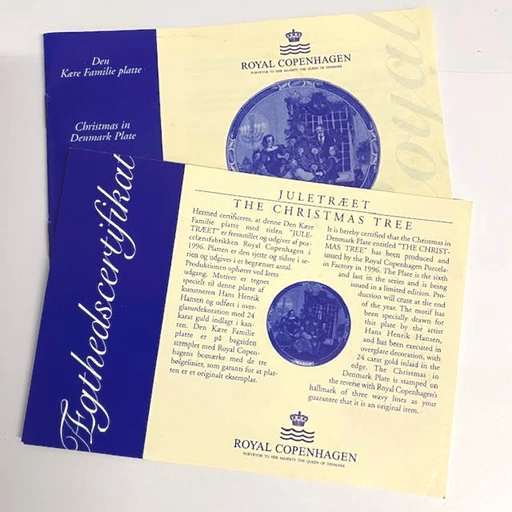 1996 Royal Copenhagen Christmas plate in the Christmas in Denmark series, designed by Hans Henrik Hansen. The title of this 1996 Christmas in Denmark plate is The Christmas Tree. Royal Copenhagen started this Christmas in Denmark series in 1991 and ended it in 1996. The philosophy of making the Christmas plates in this series was to created a Christmas plate which had more modern expression in colours and motifs than the highly appreciated blue Christmas plates.