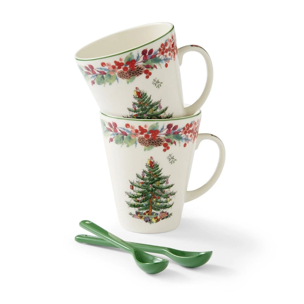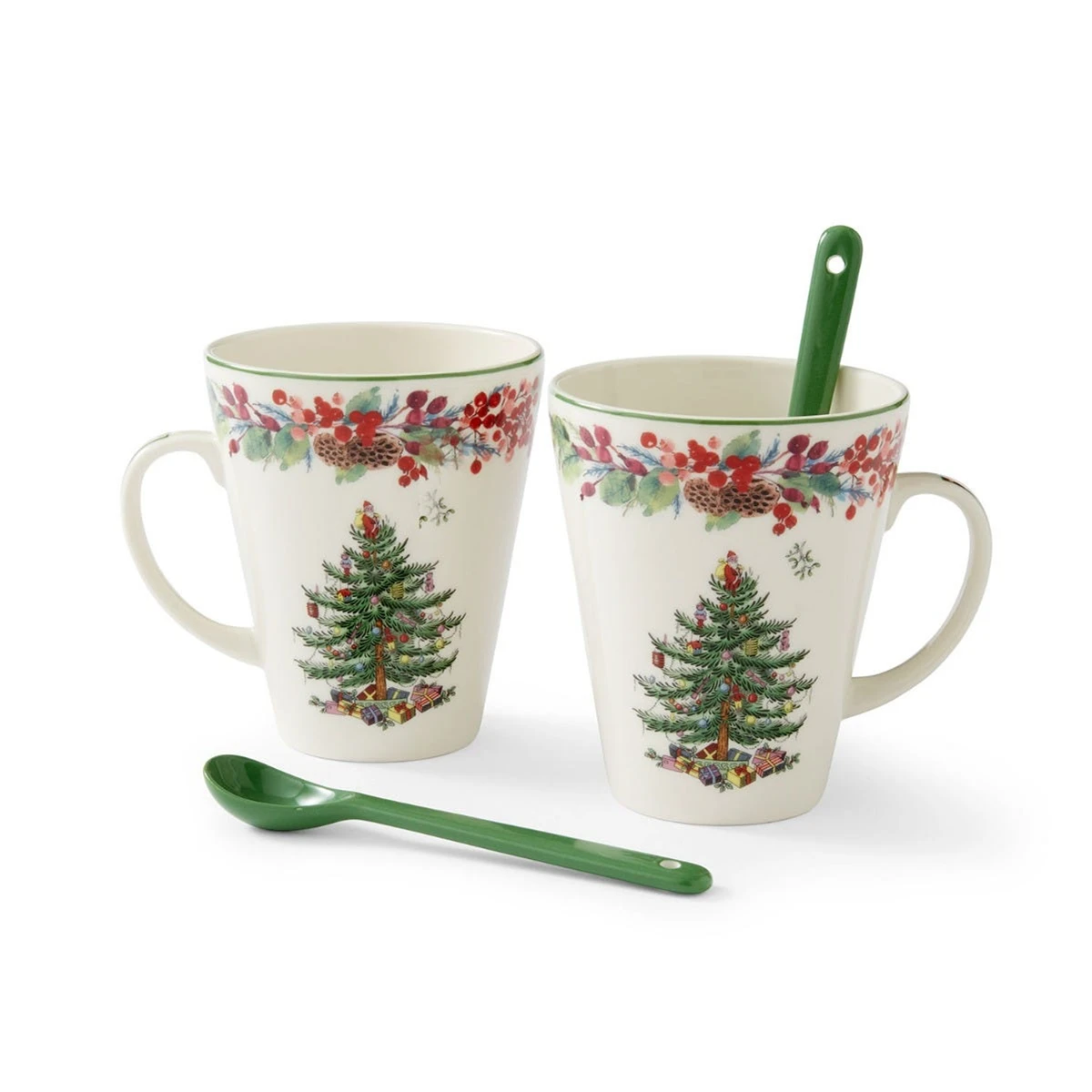 Indulge in your favourite festive hot drinks with this limited-edition mug set for two. For a twist on a classic, the mugs feature the iconic Spode Christmas Tree design on either side, with a beautiful watercolour garland adorning the rim and handle. Two deep-green ceramic spoons are included, perfect for stirring in syrups and enjoying whipped cream-topped hot chocolates. An exclusive design for 2023, this mug set makes a wonderful gift for collectors of Spode’s Christmas Tree collection.