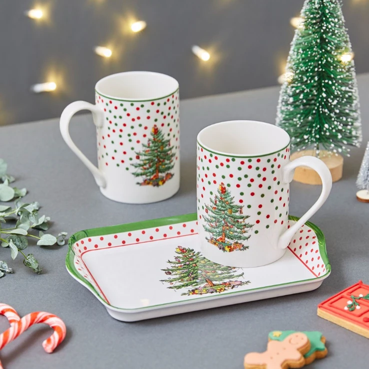 The festive season calls for warming tipples and scrumptious treats, and this Polka Dot Mug and Tray is perfect for just that. Serve up an indulgent hot chocolate or a spice-infused mulled wine alongside a warm mince pie…or two, with this fun and fabulous set. Part of our much-loved Christmas Tree collection, the two porcelain mugs and melamine tray feature the iconic Spode Christmas tree design with a playful green and red spot print for an added touch of fun.