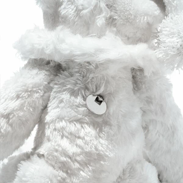 An enchanting addition to the musical Christmas Teddy bear series is this 30 cm tall white Teddy bear. In a festive spirit, he plays “White Christmas” – and this world-famous song is reflected everywhere in his loving design. The muscial notes are embroidered on his golden footpad. His fringed snow-white hat with pom-pom and collar ruff complement his overall snow white look. His coat made of soy bamboo viscose and a gold embroidered nose complete his Christmassy appearance.