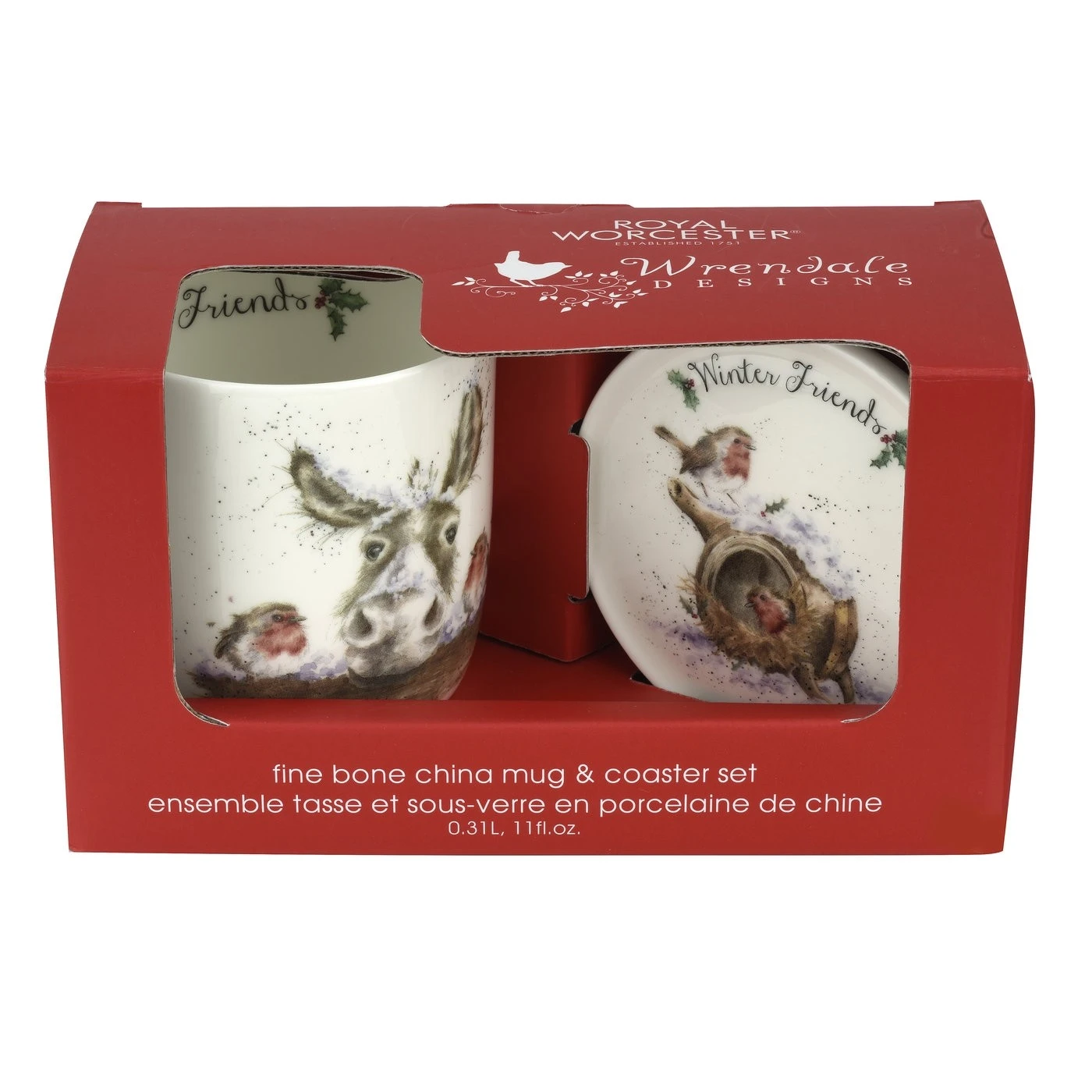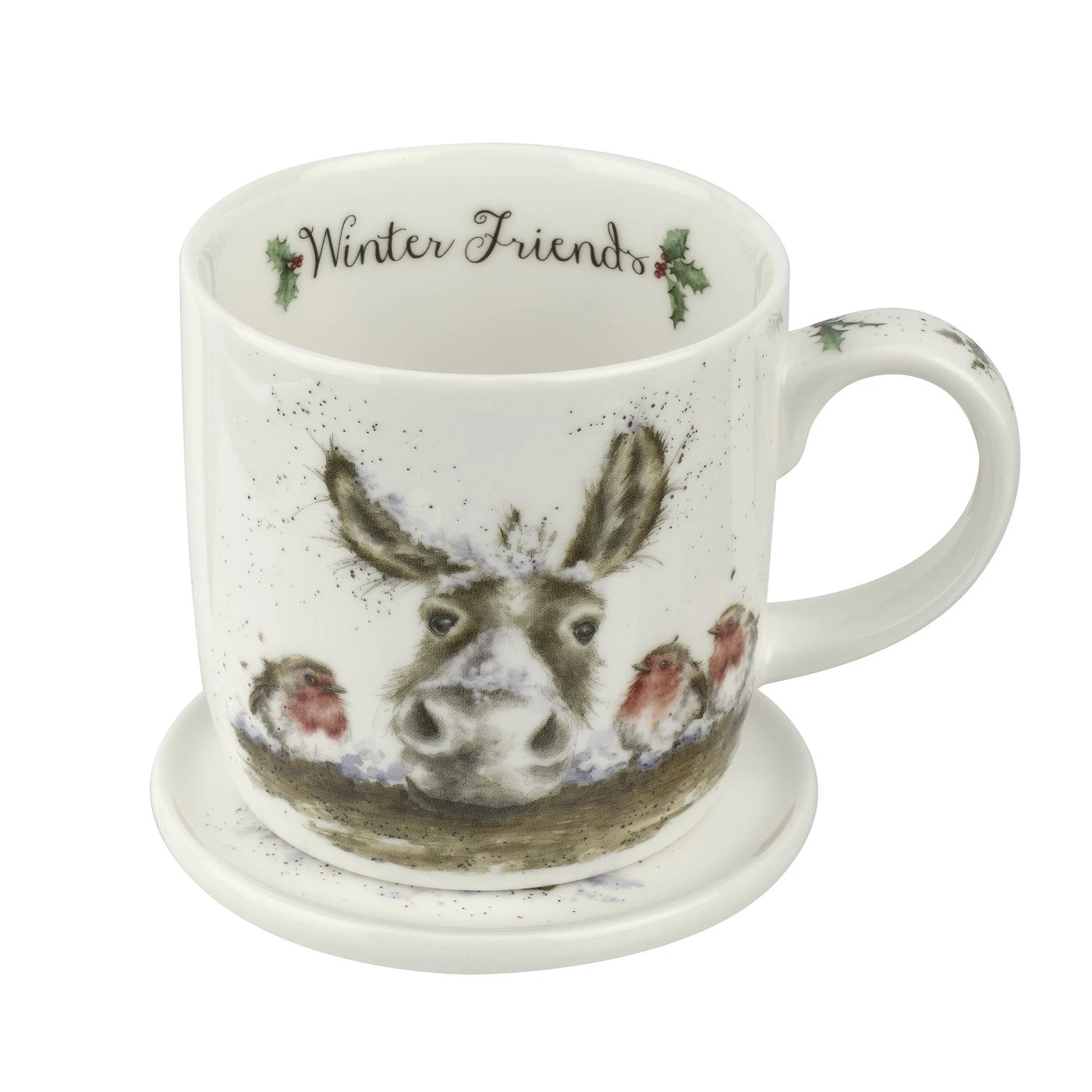 The perfect Christmas gift, this adorable fine bone china mug and coaster set from Royal Worcester Wrendale Designs features a festive illustration of a donkey and three brave robins.
